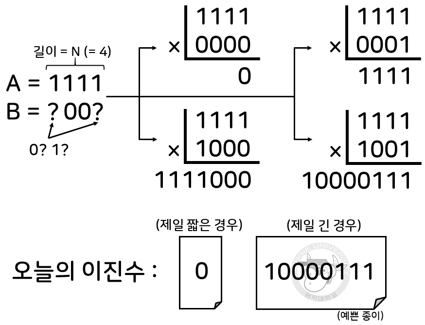 예를 들어, N = 4라면 A = 1111이다. 여기서 B = ?00?라고 해보자. ?는 기억하지 못하는 비트를 의미한다. 그렇다면 B는 0000, 0001, 1000, 1001중 하나일 것이다. 따라서 이 경우 "오늘의 이진수"는 A×B, 즉 0, 1111, 1111000, 10000111중 하나일 것이다. B는 leading zero를 포함할 수 있지만, "오늘의 이진수"는 leading zero를 생략한다. 즉, B는 맨 앞 자리가 1이 아닐 수 있지만, 진수씨가 "오늘의 이진수"를 적을 때에는 A×B=0일 때를 제외하면 맨 앞자리가 반드시 1이 되도록 0을 생략한다.