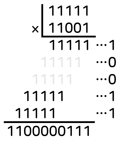 이진수의 곱셈 역시 십진수를 곱하는 것과 유사한 방식으로 계산할 수 있다.
