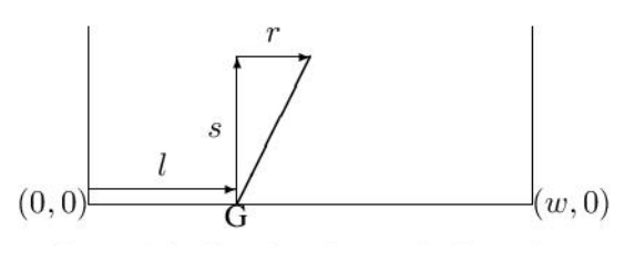 Input begins with seven values w h n m l r s (all integers except for l). The first four denote the width and height of the screen (1 ≤ w, h ≤ 1 000), the number of balls shot by the gun (1 ≤ n ≤ 500), and the number of objects on the screen (1 ≤ m ≤ 20). The last three describe the location of the gun along the bottom edge of the screen (0 ≤ l ≤ w) and its orientation, as shown in Figure D.2 (−10 ≤ r ≤ 10, 1 ≤ s ≤ 10).