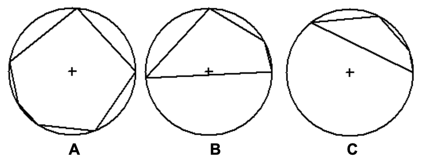 Joe would prefer a layout like the leftmost (A), but definitely does not want one where the center of the circle is outside the garden polygon like the rightmost (C) example.