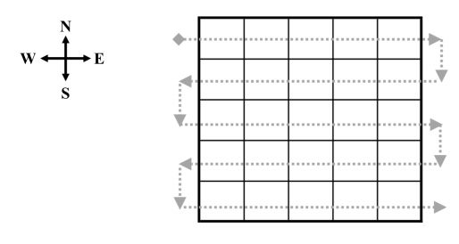 With this handy tool, Javasar came up with the perfect plan! He will travel outside the kingdom, to the West of the parcel that is at the North-West corner, and then he will visit each parcel exactly once following the route that the picture below shows. Notice that Javasar will enter and leave Nlogonia several times. In this way he will avoid activating or deactivating the MDT when he is inside the kingdom, and then nobody will see him manipulating the tool. Although the MDT is magical and divine, it does not activate or deactivate by itself.