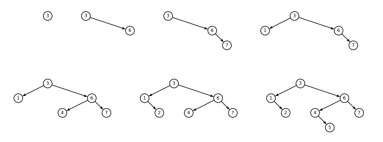 Recall that a binary search tree is a binary tree with each node storing a key, and the property that the key of each node is greater than all keys in the left subtree of that node and less than all keys in the right subtree. A new key is inserted into the tree by adding a new leaf node with that key in the only position such that the property is maintained, as seen in the figure below.