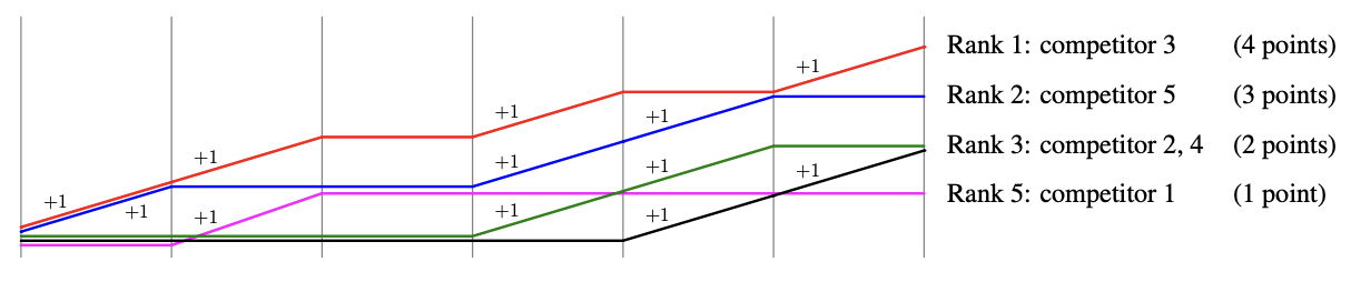 At the end of each week, competitors are ranked by the total number of points accumulated so far, highest first. In case of a tie, they share the same rank. In other words, the rank of a competitor is one more than the number of people with a strictly larger number of points.
