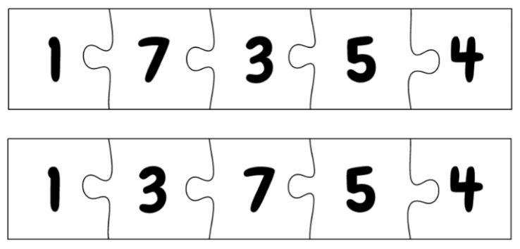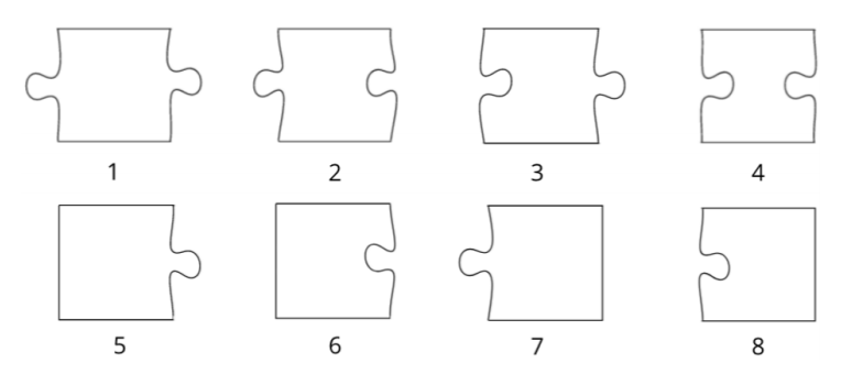 Fabian wishes to arrange all of the pieces into a single row such that the first (leftmost) piece is of type 5 or 6 and the last (rightmost) piece is of type 7 or 8. Two pieces can be placed next to each other if and only if their neighbouring borders are of different shapes, i.e., one has a bump (also called outie or tab) and the other has a hole (also called innie or blank).