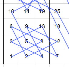 오른쪽과 위쪽으로 무한히 많이 뻗어 나가는 격자판이 있다. 이 격자에서 왼쪽에서 x번째, 아래에서 y번째 칸에는 수 $$\frac{(x+y-1)(x+y-2)}{2}+y$$가 쓰여 있다. 이 방법을 사용하면, 각 칸을 하나의 양의 정수에 일대일 대응시킬 수 있다.