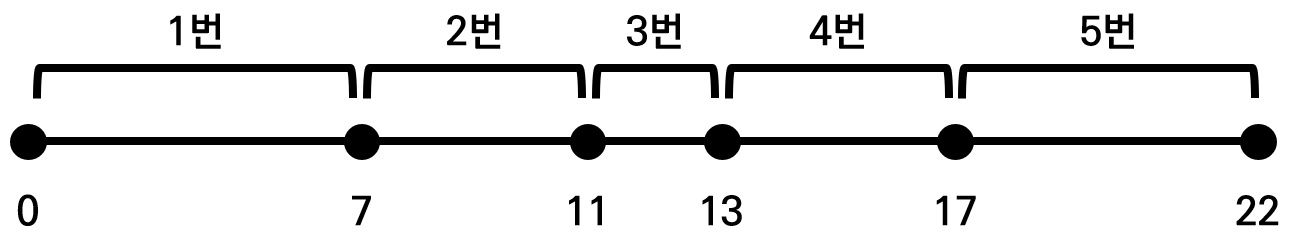 예를 들어 N=5일 때, 각 코스의 길이가 차례대로 7, 4, 2, 4, 5라고 가정하자. 출발 지점을 0이라고 하면, 전체 코스가 구성된 형태를 다음과 같이 그릴 수 있다.
