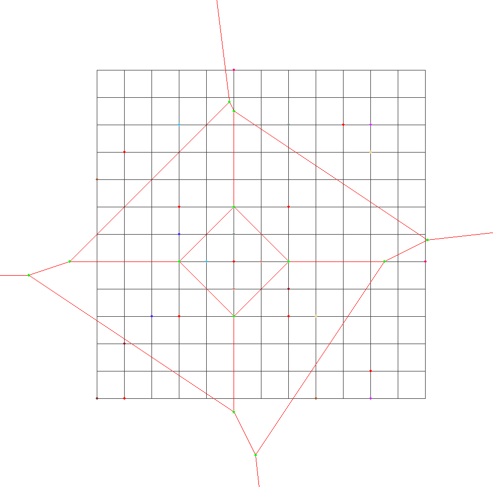 지상은 2차원 평면으로 나타낼 수 있고, $i$번 성물은 좌표 $(X_i,Y_i)$에 박혀있다. 어떤 좌표 $(x,y)$가 $i$번 성물을 중심으로 하는 성지에 포함될 조건은, $L_i(x,y)=\sqrt{(X_i-x)^2+(Y_i-y)^2}$라고 할 때, $L_i(x,y)$가 $L_1(x,y), L_2(x,y), \cdots, L_N(x,y)$중 최솟값이 되는 것이다. 이런 상황에서, 두 성지는 같은 좌표들을 공유할 수 있고, 이때 두 성지의 중심이 되는 두 성물 사이에는 연결이 생긴다. 두 성지가 공유하는 점들의 형태는 선분, 반직선, 혹은 직선이 되는데, 신은 선분이 생기면 길이가 모두 $10^{-6}$이상이 되도록 성물을 배치했다.