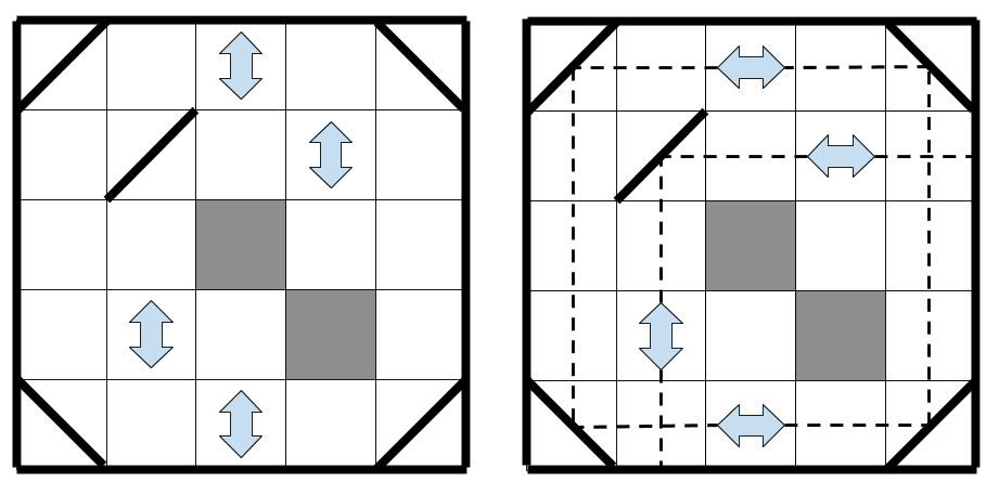 In addition to the ‘\’ and ‘/’ mirrors, the tomb is surrounded by walls of mirrors. The following common sense about light is assumed: