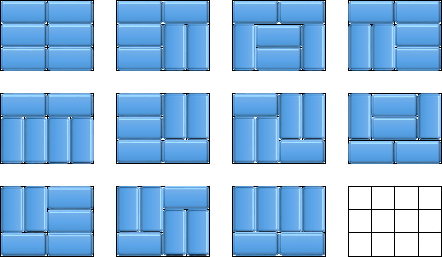 The following image shows all possible ways (11 in total) for the 3 × 4 grid.