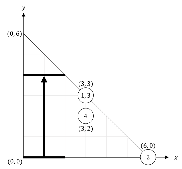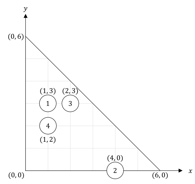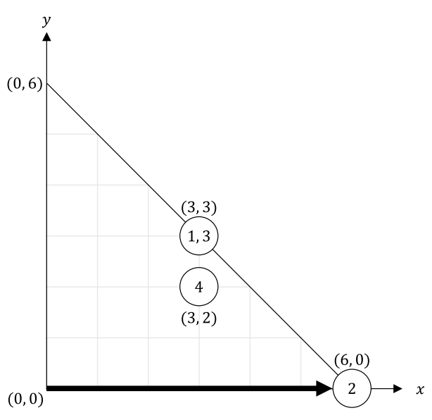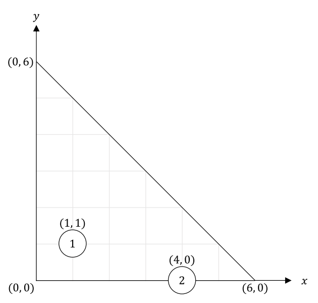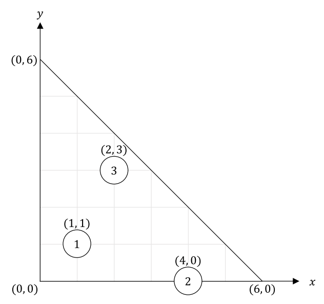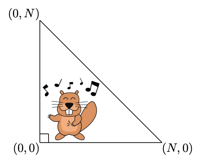 Bitaro’s room is an isosceles right-angled triangle whose leg has length N. A point in Bitaro’s room is represented as the coordinate (x, y) with 0 ≤ x ≤ N, 0 ≤ y ≤ N, x + y ≤ N. The vertex of the right angle is the origin. The two legs of the triangle are the x-axis and the y-axis.