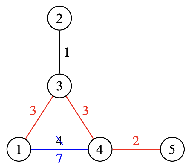 Syrup the Turtle lives in a town with a layout consisting of N locations connected by M roads. Each location is indexed from 1, 2, ..., N and each road is indexed from 1, 2, ..., M. The ith road directly connects locations Ai and Bi, has a length of Wi units, and can be traversed in either direction. These roads and locations are arranged such that it is possible to directly or indirectly travel between any pair of locations, and no two roads share the same endpoints.