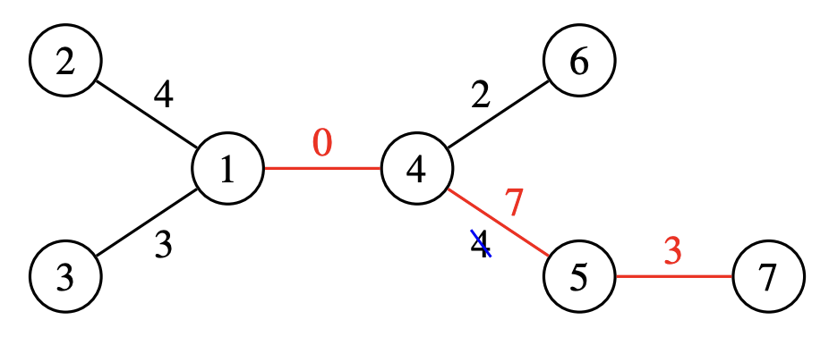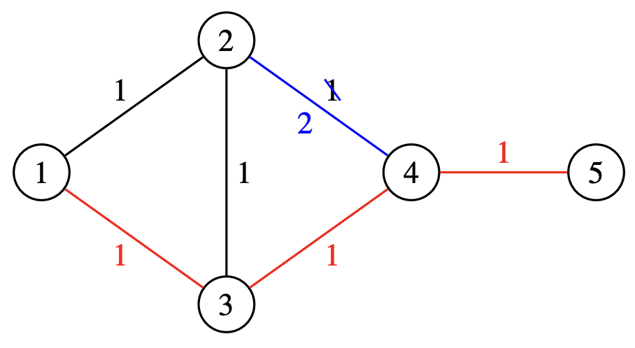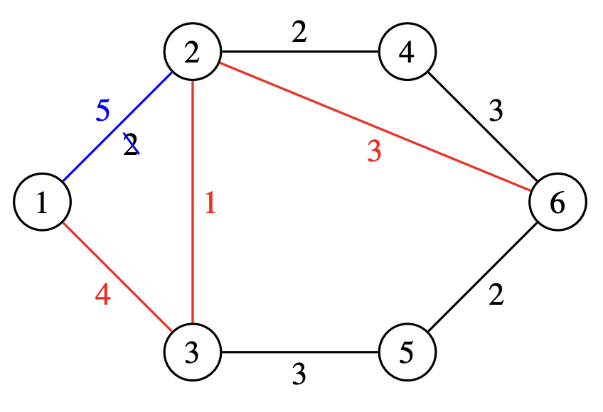 The shortest path between locations 1 and 6 is initially 1 → 2 → 6, with length 5. If road 3, marked in blue, happens to be extended by any of the more aesthetic roads with length 3, the length of the shortest path could increase to 8 as marked in red.