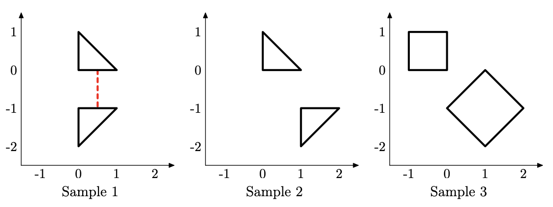 Elbrus is a novice racer, and he plans to participate in the race, but he has not trained enough yet, so he can't maneuver in space. Fortunately, it can happen that there is a direct route between asteroids, so a space ship can fly from one asteroid to another without turning at all. In other words, it is possible to choose start and finish points so that the segment between them is perpendicular to the edges that contain the points, and the segment doesn't intersect the interior of the asteroids.