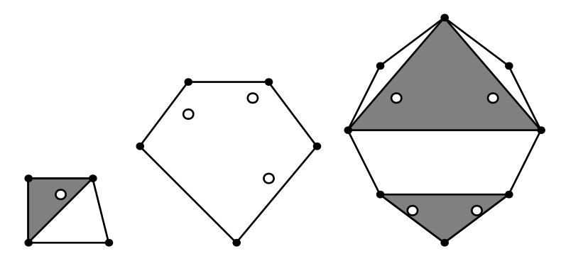 Зал имеет форму выпуклого многоугольника, а сувениры --- это точки внутри этого многоугольника. Директор хочет выбрать один или два треугольника с вершинами в углах зала, так чтобы эти треугольники не имели общей внутренней части (то есть площадь их пересечения была равна нулю), а каждый сувенир оказался внутри одного из треугольников.