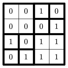 Правильное квадродерево для данной матрицы. \\Любой квадрат, у которого все четыре стороны выделены, является ячейкой квадродерева.