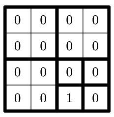Для ее хранения с помощью квадродерева необходимо 9 ячеек: одна для всей матрицы, четыре для четырех квадратов $2 \times 2$, три из них содержат 0, а четвертый, соответствующий нижнему правому углу, разбивается еще на четыре.