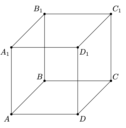 Одним из самых простых геометрических тел является куб. Обозначим четыре вершины нижней грани куба в порядке обхода как $A$, $B$, $C$ и $D$, а четыре вершины верхней грани куба, находящиеся над ними, как $A_1$, $B_1$, $C_1$ и $D_1$, соответственно.
