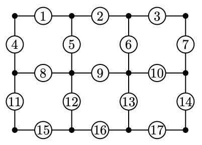 Пример игрового поля приведен на рисунке, перекрестки обозначены черными точками, дороги --- отрезками, а число на дороге задает начальное количество золотых монет на ней.
