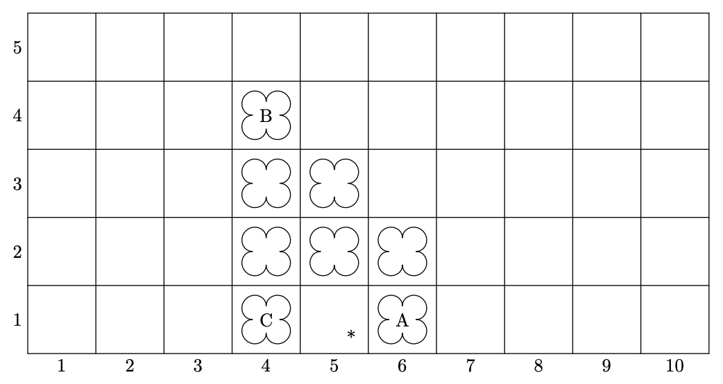 Черепахи считают, что кувшинки в пруду расположены удобно для черепах, если черепаха может с любой кувшинки добраться до любой другой, используя для перемещения только два направления. Например, кувшинки в пруду на рисунке выше расположены неудобно, так как с кувшинки, отмеченной буквой C, нельзя добраться до кувшинки, отмеченной буквой A. Если же добавить к имеющимся кувшинкам кувшинку на клетку, отмеченную звездочкой, то кувшинки в пруду будут расположены удобно для черепах.