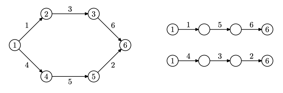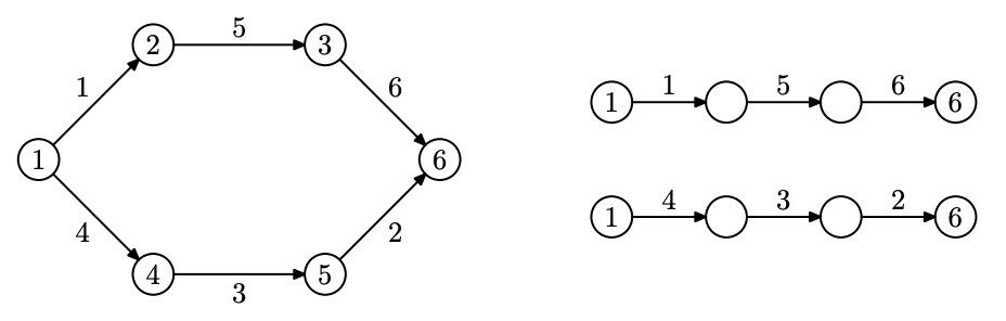 Следующие $2k$ строк описывают маршруты. Первая строка описания маршрута содержит три целых числа $l_i$, $s_i$ и $t_i$ --- число дорожек в маршруте, номер перекрестка, где маршрут начинается и номер перекрестка, где он заканчивается ($1 \le l_i \le n$, $1 \le s_i, t_i \le n$, $s_i \ne t_i$). Во второй строке содержится $l_i$ чисел --- последовательность номеров на табличках на клетках, вдоль которых проходит этот маршрут.