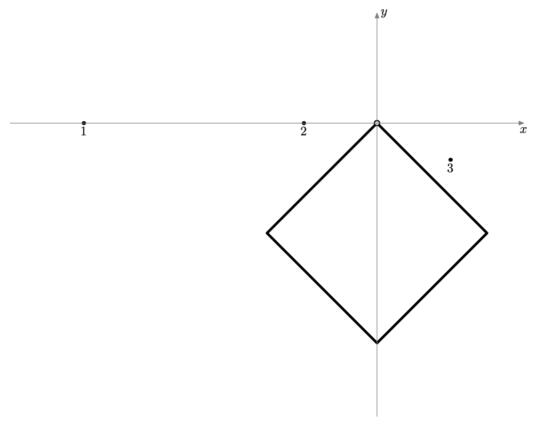 На рисунке выше изображен тест из примера. Прямоугольник показывает начальное положение пластины. Точками показаны позиции, в которые Вася планирует забить гвоздь.