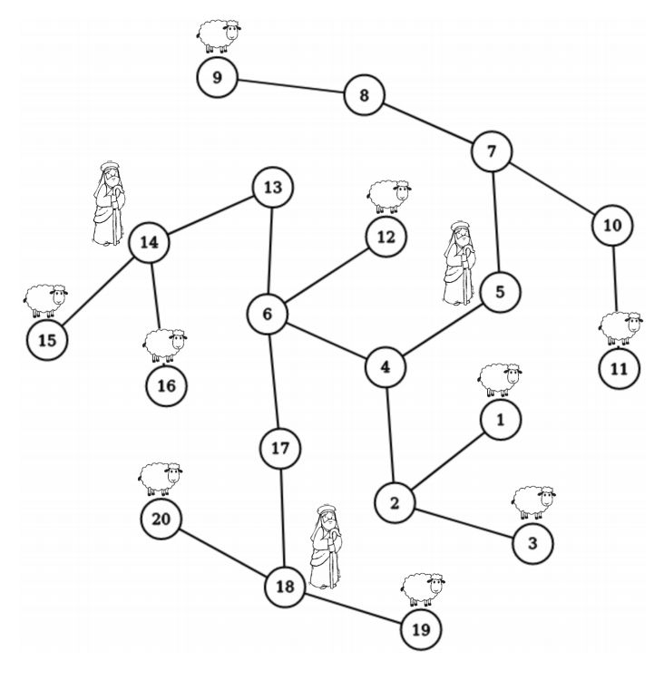 A flock of K sheep lives in a tree, a simple connected graph without a cycle. The tree contains N nodes denoted with integers from 1 to N. Each node of a tree is a home to at most one sheep. A wise shepherd realized that, sooner or later, wolves will learn how to climb trees.