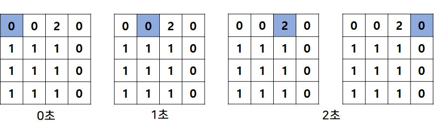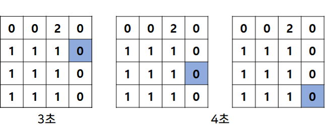 0초 (1,1) -> 1초 (1,2) -> 2초 (1,3), (1,4) -> 3초 (2,4) -> 4초 (3,4), (4,4) 경로로 4초 만에 도착할 수 있다.