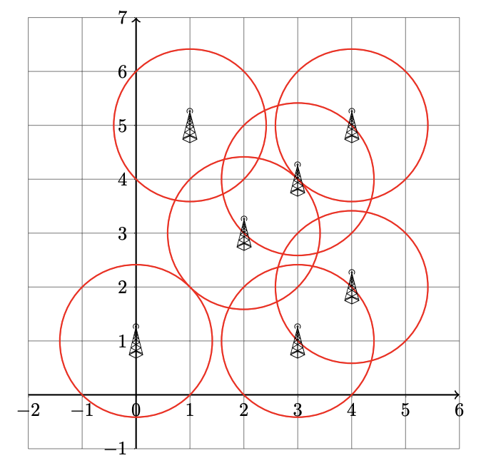 His mission is to network n antennas that are scattered across a vast desert, which can be represented as a 2D plane. He will set the transmission radius of each antenna to be the same non negative real number r. The range of an antenna is defined as the set of all points whose distance to the antenna is at most r. If ranges of two antennas have a common point, those antennas can directly communicate. Also, if antennas A and B can communicate, as well as antennas B and C, then antennas A and C are also able to communicate, through antenna B.