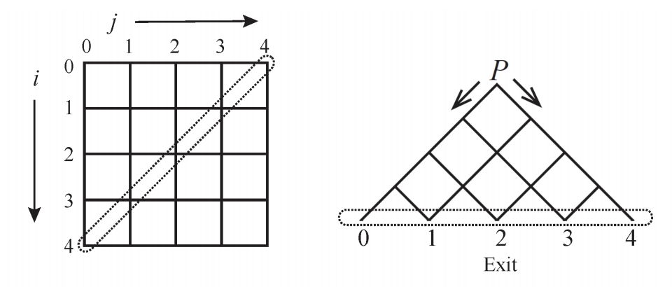 Consider an n×n grid where nodes are labelled as (i, j) for 0 ≤ i, j < n. We rotate it 45 degree in clockwise direction and keep only its top half part. Then you get a pyramid, as shown in Figure 1. All of the nodes laid on the anti-diagonal of the grid have labels (n − 1 − j, j) for 0 ≤ j < n. They are located at the bottom line of the pyramid. For simplicity and clarity, we name node (n − 1 − j, j) as exit j. Node (0, 0) is called the starting point (labelled as P in Figure 1). When you insert a ball from the starting point, this ball will roll down to some of the exits. A ball located at node (i, j) can only roll down to either node (i + 1, j) or node (i, j + 1), and the ball shall never be broken or split. There is a tiny switch equipped on every node other than the exits that controls the move direction of the ball, and this switch always works well. The switch has exactly two states: either L or R, indicates that the ball can move to node (i + 1, j) or (i, j + 1), respectively. After the ball leaves this node, the switch changes immediately to the other state. The default setting for a switch is at L.