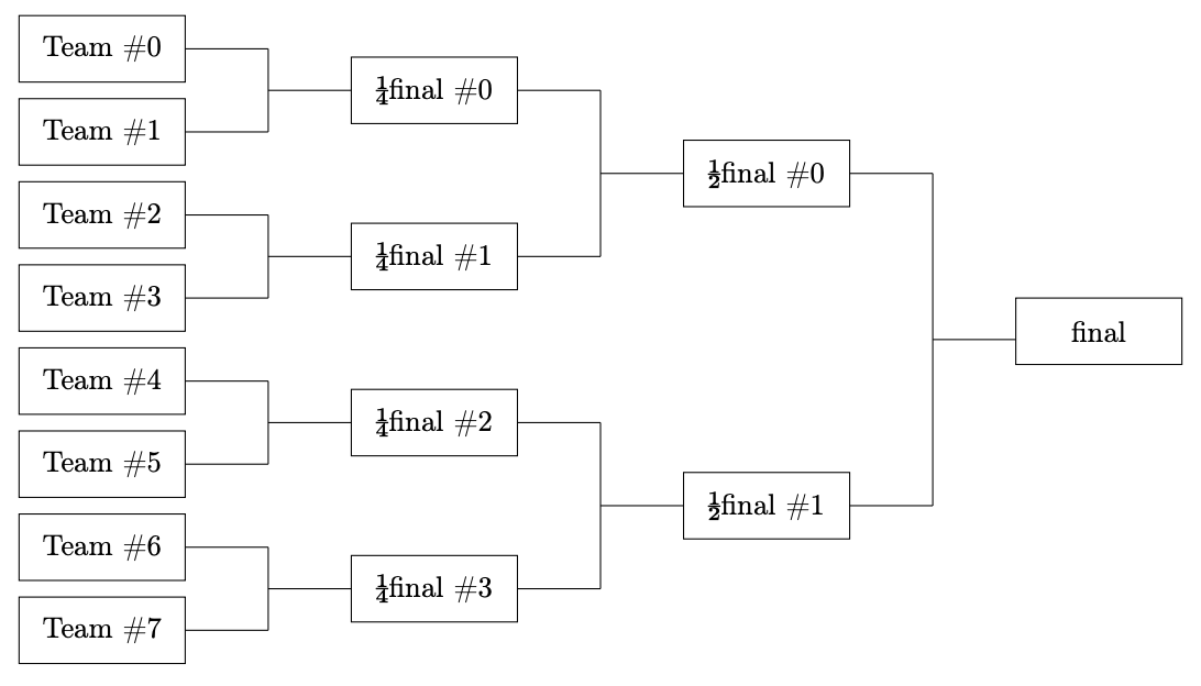 In the region of Concordia, the teams of a famous alliance of technical universities hold a wallyball tournament every year. Your university, Beaver Valley Institute of Mines and Telecommunication Tech, is a proud participating institution. The model of the tournament is quite simple. As there are eight teams, they are arranged in four pairs to play a quarter-final. The winners of the quarter-final are arranged in two pairs to play two semi-finals. And finally, the winners of the semi-finals meet for the final.