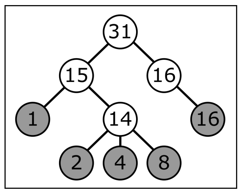 Cada nó contém um valor inteiro. Um nó que não é folha contém a soma dos valores dos seus filhos diretos. Portanto, todos os valores da árvore são determinados pelos valores contidos nas folhas.