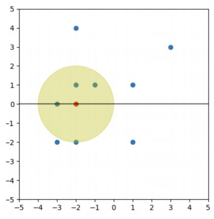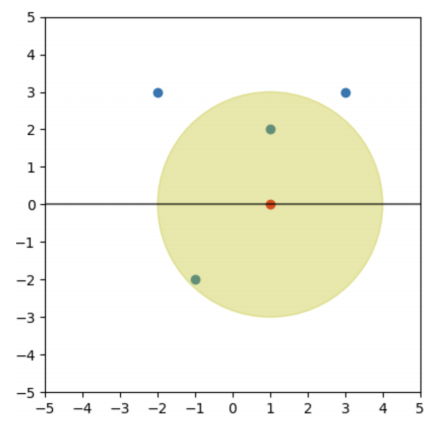 Napomena: Kuća je obasjana ako se nalazi na rubu ili unutar kružnice radijusa r u čijem središtu se nalazi fenjer. Optimalna pozicija fenjera ne nalazi se nužno na cjelobrojnim koordinatama.