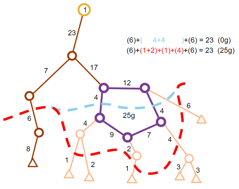 예시1의 고구마 그래프가 하늘색 절단선으로 끊겨도 끊기는 간선 강도의 총합은 같지만, 준표는 뽑히는 덩이뿌리의 질량이 최대가 되도록 고구마 그래프를 뽑기 때문에 빨간색 절단선 대로 잘린다.