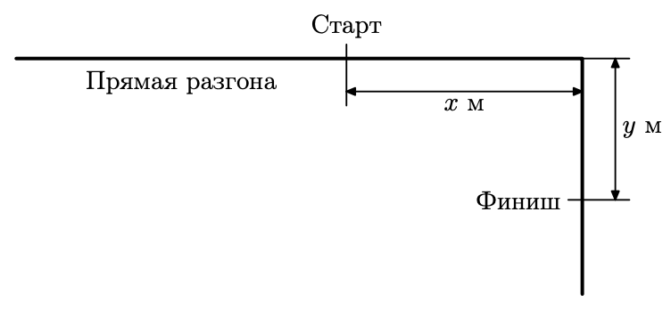 Трасса в Берляндии устроена следующим образом. Сначала идет длинная прямая, на которой машины могут разогнаться до любой скорости от 0 до $v$. Затем следует линия старта, после которой следует отрезок длиной $x$ м, поворот на 90$^\circ$ и отрезок длины $y$ м, после которого находится линия финиша. Линию финиша машина может пересечь на любой скорости.