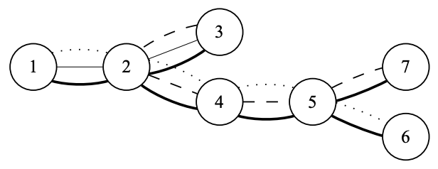 Третий пример изображён на рисунке выше. Жирными линиями обозначены переходы между сотрудниками. Тонкими линиями обозначен путь первого курьера между сотрудниками 1 и 3. Длинным пунктиром обозначен путь второго курьера между сотрудниками 3 и 7. Коротким пунктиром обозначен путь третьего курьера между сотрудниками 1 и 6.