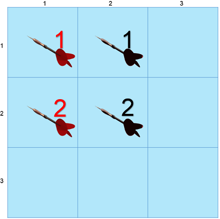예를 들어, 위와 같은 상황을 보자. 붉은색 다트는 승규가 던진 다트이고, 검은색 다트는 의석이가 던진 다트이다. 다트 위에 써져있는 숫자는 다트가 던져진 라운드를 의미한다. (가중치는 모두 1로 동일하다.) 위 상황에서 1라운드에서 의석이가 얻는 점수는 1점이고, 2라운드에서 의석이가 얻는 점수는 3점이다. 즉 의석이가 원래 얻는 총점은 4점이다. 여기서 의석이가 자신의 2라운드 다트를 (3,3)으로 옮기게 된다면 의석이가 얻을 수 있는 최대 총점인 14점을 얻게 된다. 혹은 여기서 의석이가 자신의 2라운드 다트를 (1,1)로 옮기게 된다면 의석이가 얻을 수 있는 최소 총점인 2점을 얻게 된다.