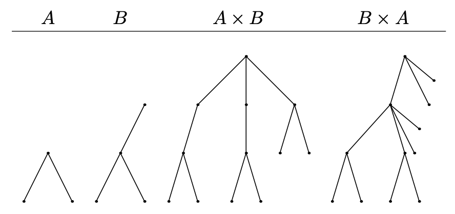 For two rooted trees $A$ and $B$, their tree product $T = A \times B$ is defined as follows: copy tree $A$, and then for each vertex $x$ in it, make a copy of $B$ and merge its root with vertex $x$. See the table below for an example: