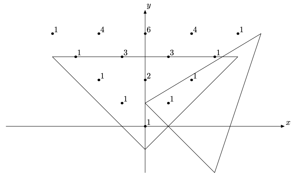 Consider two triangles on plane --- a Pascal's triangle and an ordinary triangle. Pascal's triangle is drawn with it's root at point (0, 0), and two sides along diagonals of upper-halfplane quarters. Formally, there are 1's written in points $(i, i)$ and $(-i, i)$, and between them at point $(-i + 2 k, i)$ there is a number equal to the sum of numbers at $(-i + 2k + 1, i - 1)$ and at $(-i + 2k - 1, i - 1)$ for all $k$ from $1$ to $i - 1$. An ordinary triangle is drawn as just a triangle with vertices at $(x_A, y_A)$, $(x_B, y_B)$, $(x_C, y_C)$.