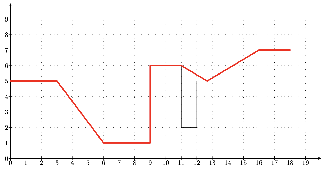 A skyline surface consists of $n$ horizontal line segments, the $i$-th segment connects points $(d_{i-1}, h_i)$ and $(d_i, h_i)$, where $d_0 = 0$. Each segment is a roof of a building.