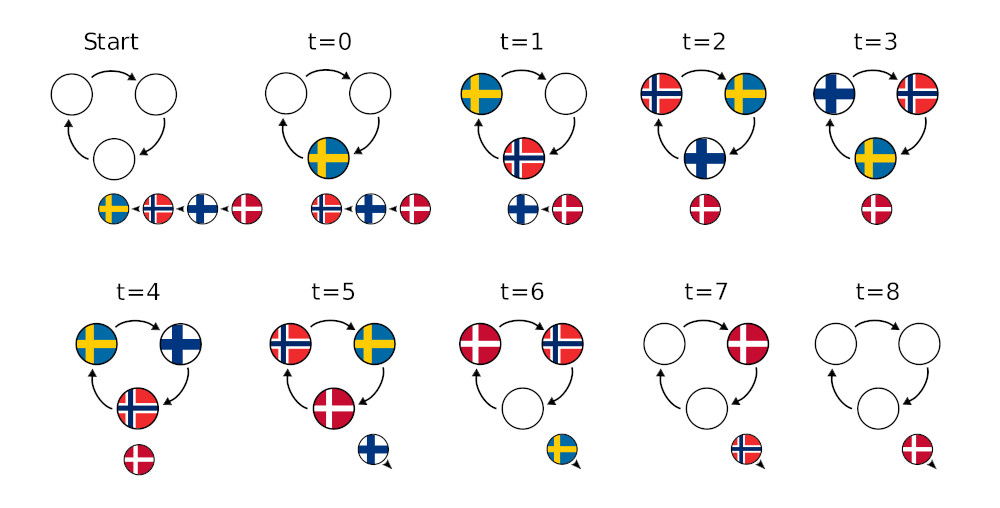 I exempelfall 1 finns det 4 lag och 3 vagnar. Lagen, som i bilden är Sverige, Norge, Finland och Danmark, vill åka 2, 2, 1 och 1 varv respektive. Notera att det danska laget inte kan gå in i pariserhjulet vid $t=3$ eller $t=4$ eftersom det svenska / norska laget redan sitter i den nedersta vagnen och vill i båda fallen åka ett varv till.