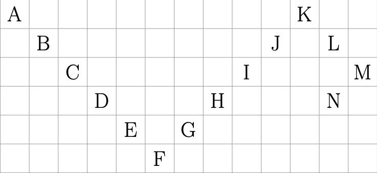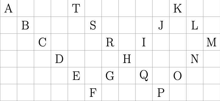 På första raden står två heltal $2 \leq N \leq 20$ och $2 \leq M \leq 20$, antalet rader och kolumner i rutnätet. På andra raden står en sträng med $K$ bokstäver ($1 \leq K \leq 30$), det krypterade meddelandet. Meddelandet består endast av bokstäverna A till Z och alla bokstäver är stora. Det är garanterat att det finns en möjlig ursprungssträng som ger denna chiffertext.