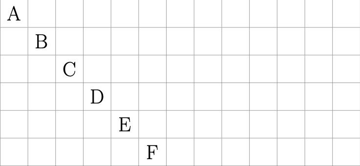 Säg att strängen vi ska kryptera är ABCDEFGHIKLMNOPQRST, och att rutnätet har storlek $6 \times 13$. Så här ser rutnätet ut vid olika tidspunkter i krypteringen: