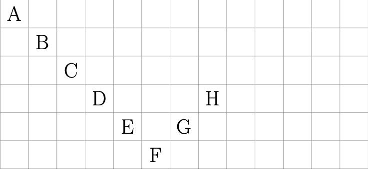 | Efter 14 bostäver är skrivna, vi har nu även studsat i övre och högra väggen | Efter alla 20 bokstäver är skrivna, notera att vi inte skrev över H:et med ett R, utan vi skrev R:et på nästa lediga plats |