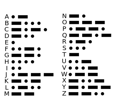 A .- B -... C -.-. D -.. E . F ..-. G --. H .... I .. J .--- K -.- L .-.. M -- N -. O --- P .--. Q --.- R .-. S ... T - U ..- V ...- W .-- X -..- Y -.-- Z --.. 3 5 5 3 4 846 111110000011111000111000001110000111000111110000011100000111110001111100000111000111110000011100000111000001111100011111000001110000011100000111110001111100011100000111110000011111000011111000001111100011100000111110000111110000011100001111100000111110000011111000001110001111100011111000001110000011111000111000001111100000111000001110000111000001111100000111000001111100011100000111000001110001110000011100000111110000011111000111000001111100000111000001110000111000001111100000111000001111100011111000001110001110000011111000001111100000111110001111100000111110001110000011111000011100000111110000011111000111000001110000011100011100000111110001110000111110000011111000001111100011111000111000001111100011100000111110000011111000011111000001111100000111110000011111000111110001111100000111000001111100000111110001111100000111000001110000011111