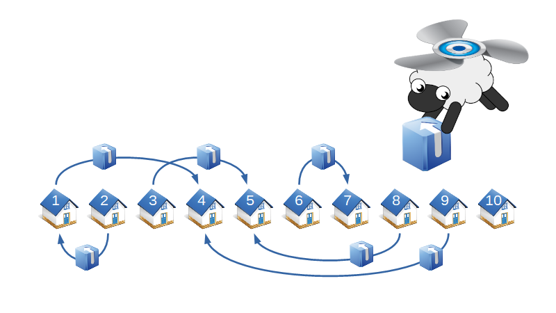 Dolly the delivery drone is out for a busy working day. It has to complete $n$ errands in a street where $\ell$ houses are lined up in a row, numbered in ascending order as $1, \dots, \ell$. The distance between adjacent houses is $1$. Each errand consists of picking up a package at some house $a$ and delivering it to another house $b$. Dolly can start with any errand, complete the errands in any order, and is able to carry an unlimited number of packages at the same time. Your job is to find the minimal total distance Dolly has to cover to complete all errands. The delivery route can start and finish at arbitrary locations along the street.