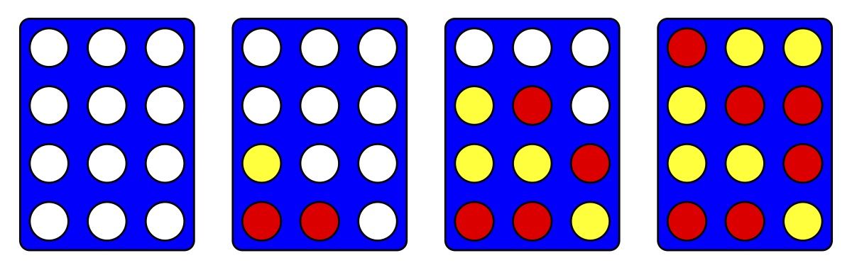 Figure G.1: Visualisation of the sample cases, showing the state of the game after 0, 3, 8 and 12 moves, respectively. Alice's tiles are shown in red, Bob's tiles in yellow.