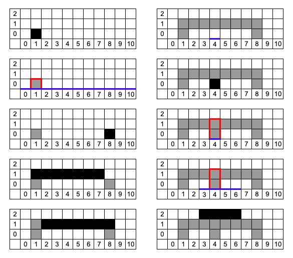 There is an cell grid infinite in left, right, and upwards directions (all the cells with coordinates $(x, y)$ with $x \in \mathbb{Z}$, $y \ge 0$ exist). Initially all the cells are white. You have to process $q$ queries of two types: