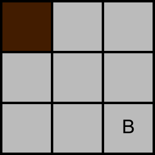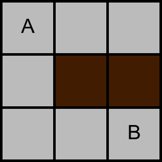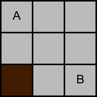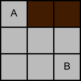 Skriv ut en rad med ett heltal, det minsta antal förflyttningar som behövs för att flytta rätblocket från cell $A$ till cell $B$.