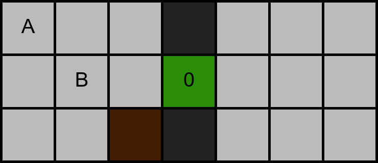 För testfall värda $40$ poäng så har en bana upp till $7$ rader och $7$ kolumner, men inga modulo-celler.