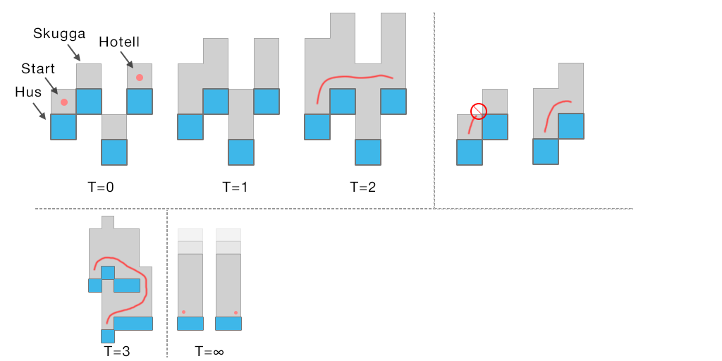 Currently, each house has a shadow that is exactly one unit square long, and is located directly north of the house. Since the sun just started to set, this shadow will extend one more unit square north per time unit. You can walk from the shadow of one house to another one, if the shadows share an edge of length at least one (see figure). You cannot walk through houses.